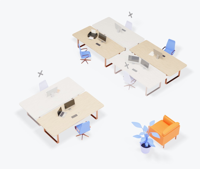 Ваши сотрудники могут самостоятельно забронировать рабочее место: стол, кабинет или переговорную комнату